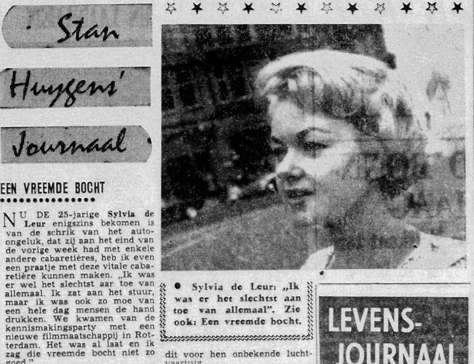 Het allereerste krantenbericht plus foto van Sylvia stamt uit 1959, toen ze d’r eerste cabaretstappen zette. Aanleiding is niet het cabaret, maar een autoongeluk. “Ik zat aan het stuur,” zegt ze in het artikel (klinkt gek eigenlijk, aan ipv achter het stuur; was dat vroeger een gewone zegswijze of is ’t haar toen nog gebrekkige Nederlands?). De auto sloeg een paar keer over de kop, de inzittenden kwamen er gelukkig met de schrik en lichte verwondingen van af. Op Sylvia na, die een shock kreeg en in het ziekenhuis opgenomen moest worden. Het komt niet veel voor dat de bestuurder er het ergst aan toe is bij een ongeluk (zeker niet in die autogordelloze tijden), in d’r boekje doet Sylvia dan ook een boekje open over deze kwestie: niet zij zat aan/achter het stuur, maar haar vriend Rob Touber. Die had geen rijbewijs dus werd besloten de schuld in haar schoenen te schuiven.