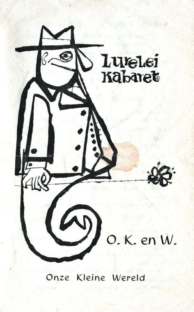Voor u opgesnord: programmaboekje van O. K. & W., eerste Lureleiprogramma waar Sylvia aan meedee, negentienzestig en twee. Eerst was ik licht teleurgesteld toen ik de koffievlekken zag, maar toen bedacht ik me: dit is échte Lurelei-koffie, zoniet gezet, dan in ieder geval ingeschonken en geserveerd door een in de pauzes bardienst draaiende Sylvia of Janine in eigen persoon! (Of Silvia en Jeanine, zoals het boekje zegt.) Naast bekende hits als Sto Mpazari en het zeemanslied-in-space Astronautenleed zien we de titel Jij Bent Neurotisch; dit was één van Sylvia’s vroege successen en één van de weinige Lurelei-nummers waar geen enkel spoor meer van terug te vinden is, zelfs de tekst niet, terwijl recensies dit lied in het bijzonder bejubelden: