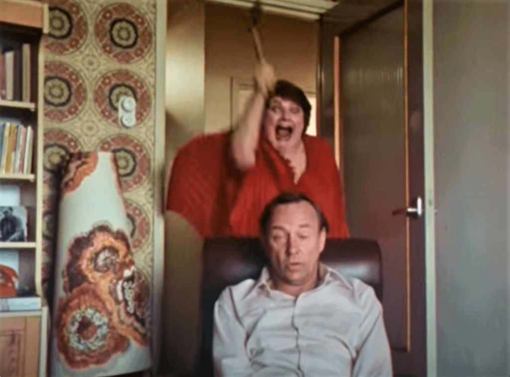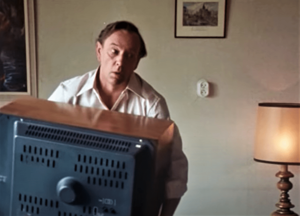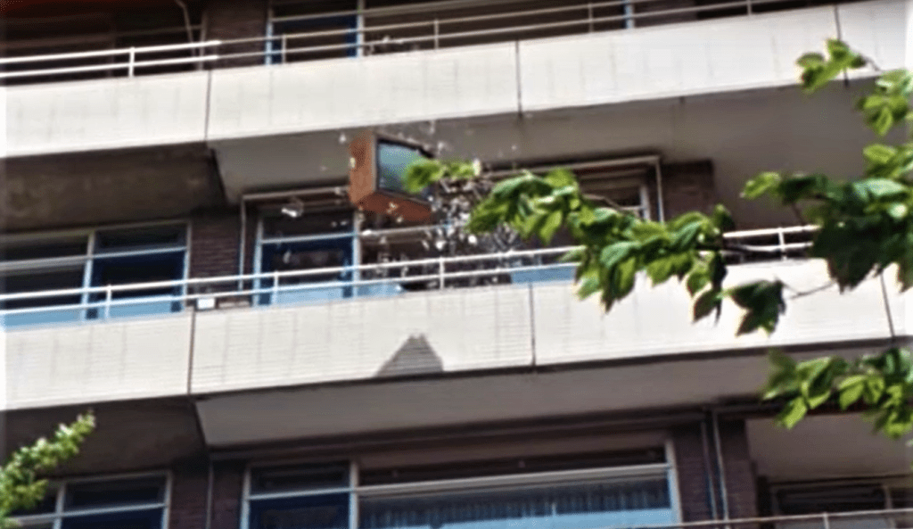 Vijftien jaar later in De Mantel Der Liefde laat Rijk iets anders zweven, nl. een televisietoestel, het raam uit…